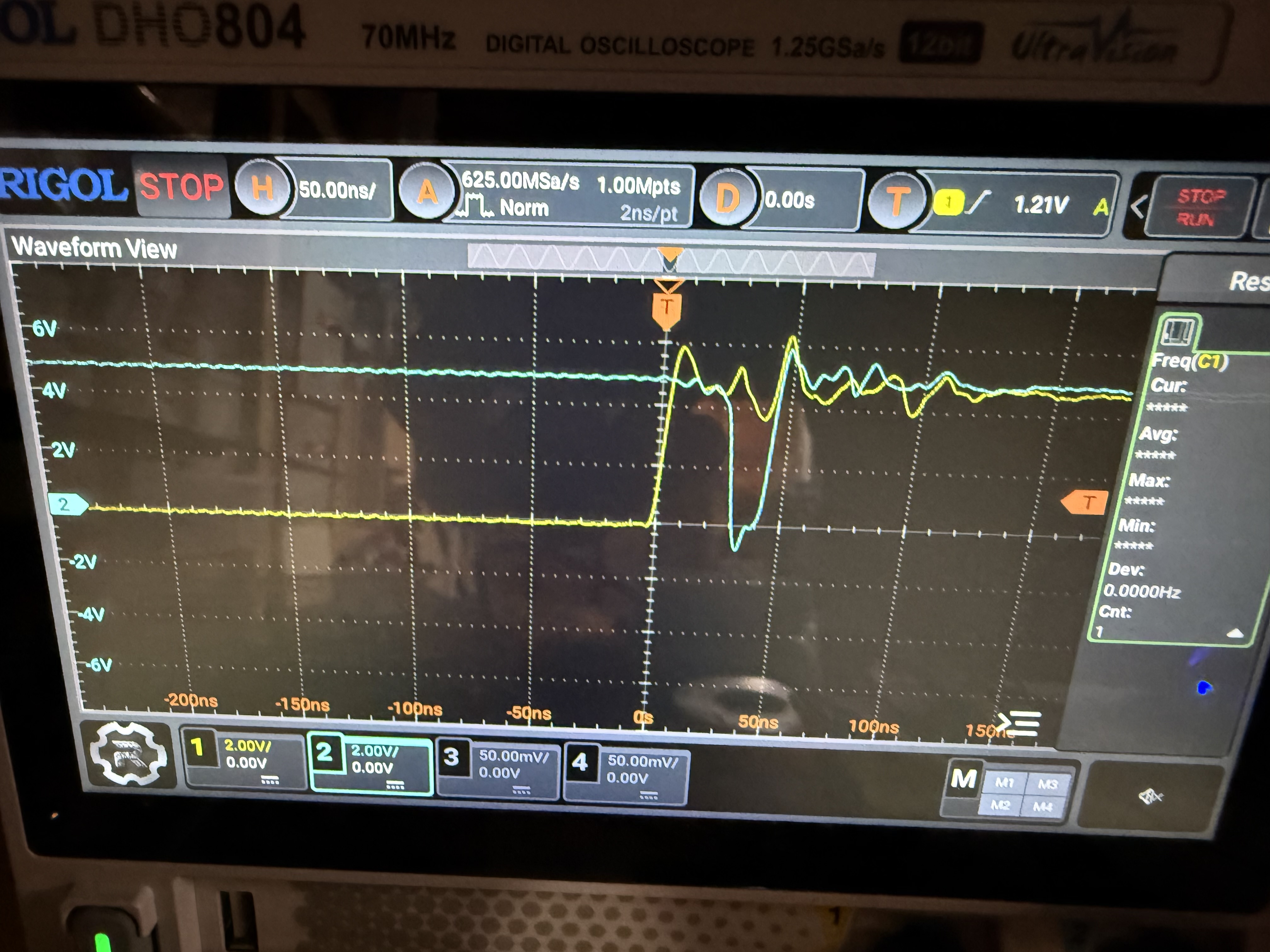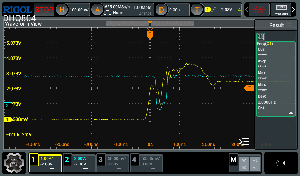 The EEPROMs I’m using for the control module glitch a lot when the input address changes. Here’s a nice example - the yellow line is an address pin changing, and the blue line is the EEPROM glitching temporarily low for about 25ns.